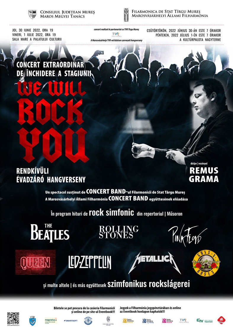 Különlegesnek és érdekesnek ígérkező koncerttel zárja idei évadát a Marosvásárhelyi Állami Filharmónia, olyan hangversennyel, amely a műfajok közötti átjárás és átjárhatóság, illetve az ebből született és születendő tartalmas és kreatív eredmény lehetőségét és jogosultságát igazolja. A koncert címét – We Will Rock You – a legendás Queen együttes dalától kölcsönözték, a rendkívüli évadzáró hangversenyen pedig a legismertebb rock- és metálzenekarok slágerei hangzanak el szimfonikus zenei átdolgozásban.