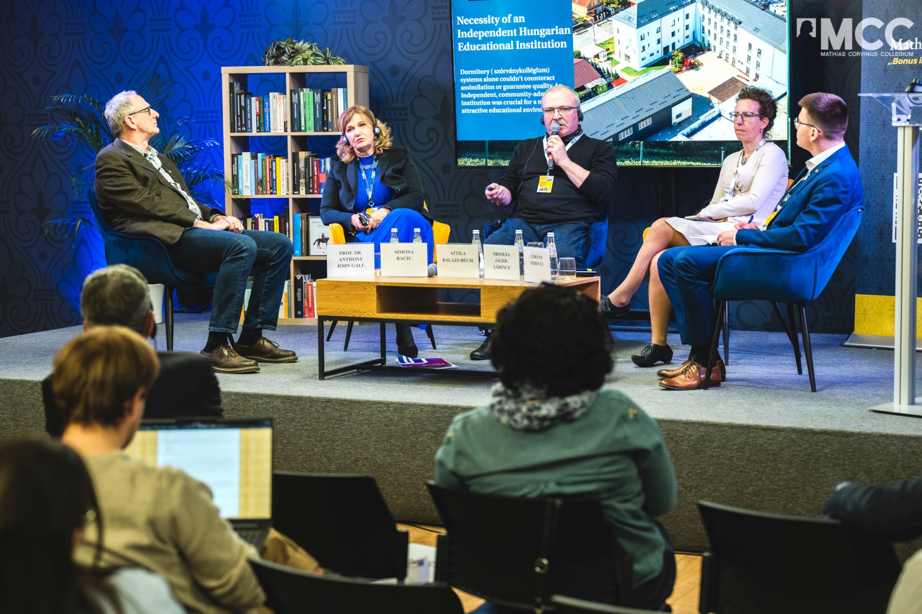 A panelt Ferencz Lóránd, az MCC Egyetemi Program hallgatója moderálta. Meghívott előadói voltak: prof. dr. Anthony John Gall, az Óbudai Egyetem Ybl Miklós Építéstudományi Karának ausztrál dékánja és az Építészeti Doktori Iskola vezetője; Simona Baciu, a Transylvania College alapítója és az iskolai mentálhigiénére szakosodott InIm Institute elnöke; Balázs-Bécsi Attila, a Téka Alapítvány igazgatója; valamint Jáger-Lőrincz Orsolya, az MCC ingatlanberuházási igazgatója.